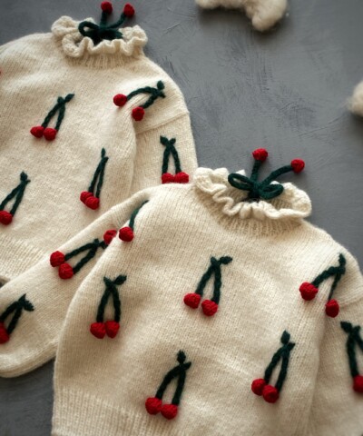 On the back of the tie-cherries.Warm and soft from baby alpaca yarn.